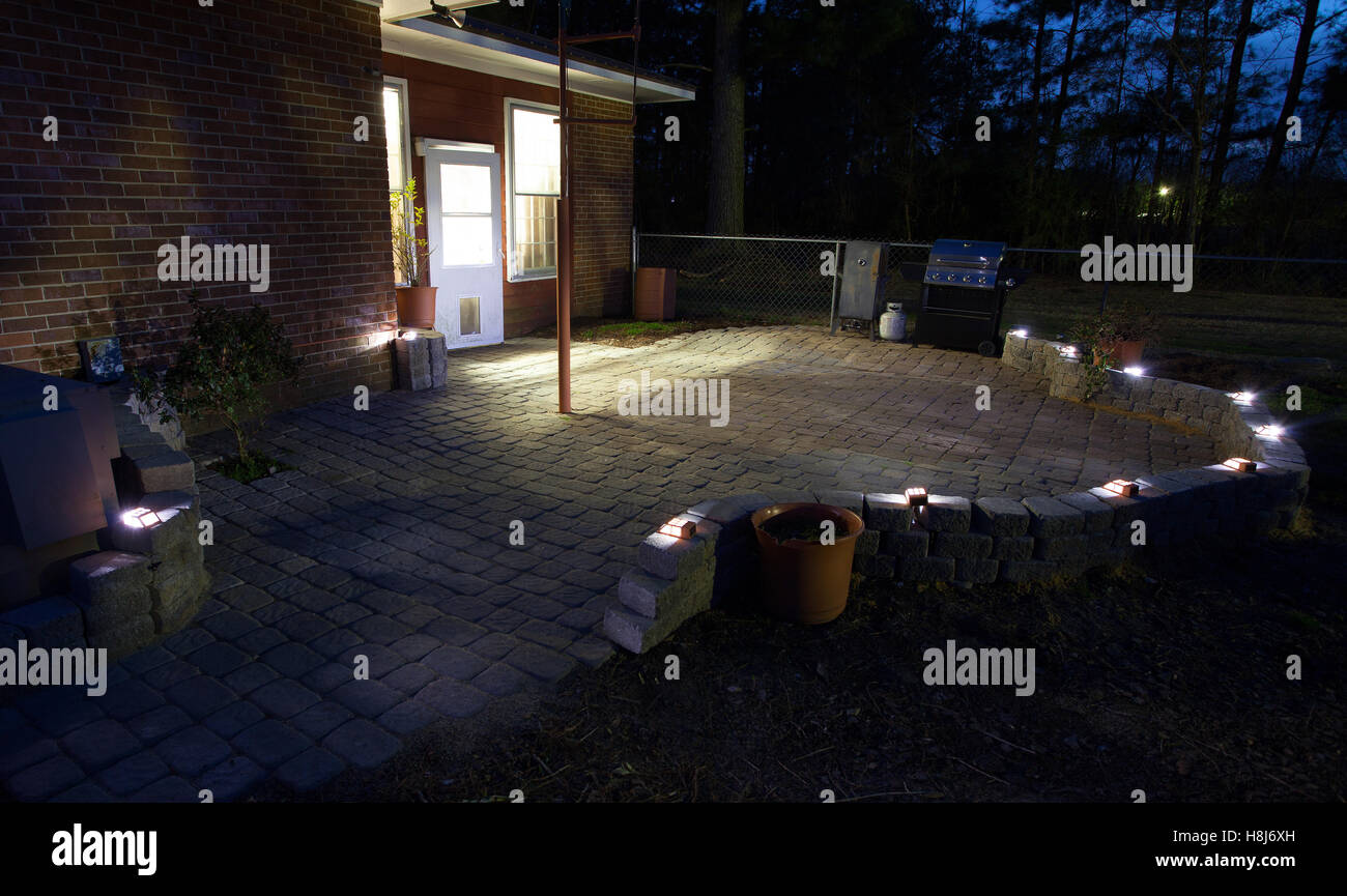 Large Sand Set Brick Patio And Solar Lights After Nightfall Stock
