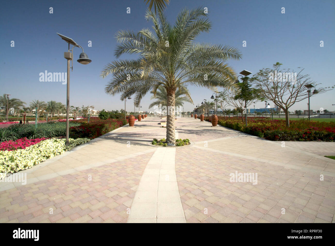 Dubai Al Barsha Pond Park Palm Tree With Solar Light Poles Stock