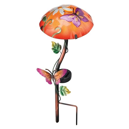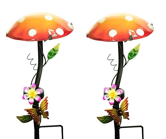 East2eden Set Of 2 Red Glass Top Metal Mushroom Solar Powered